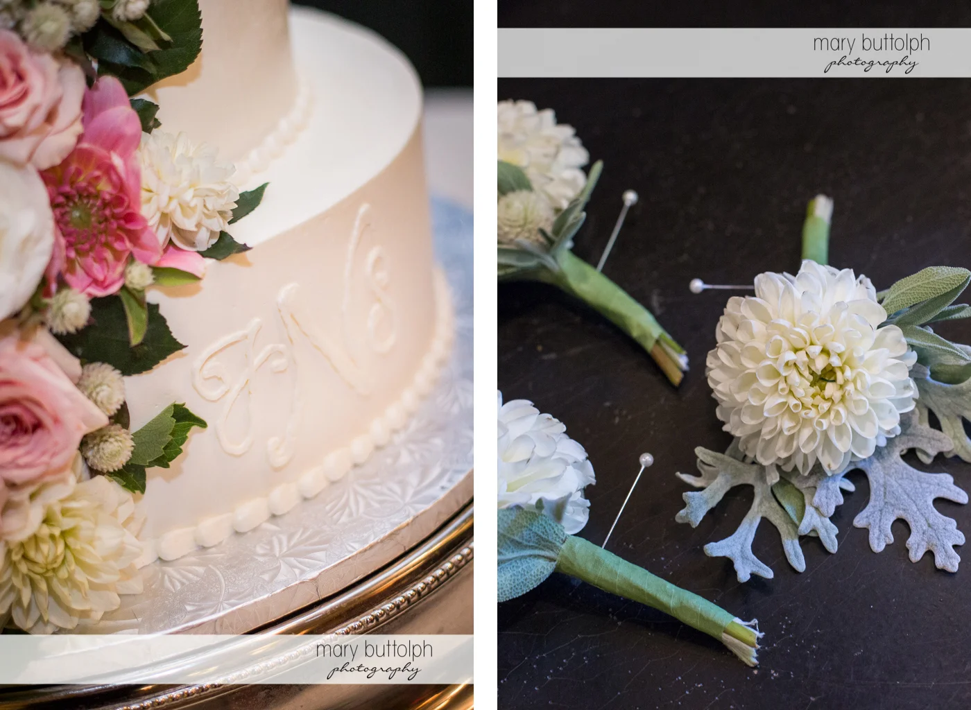 Close up shot of the couple's cake and flowers at the Inns of Aurora Wedding